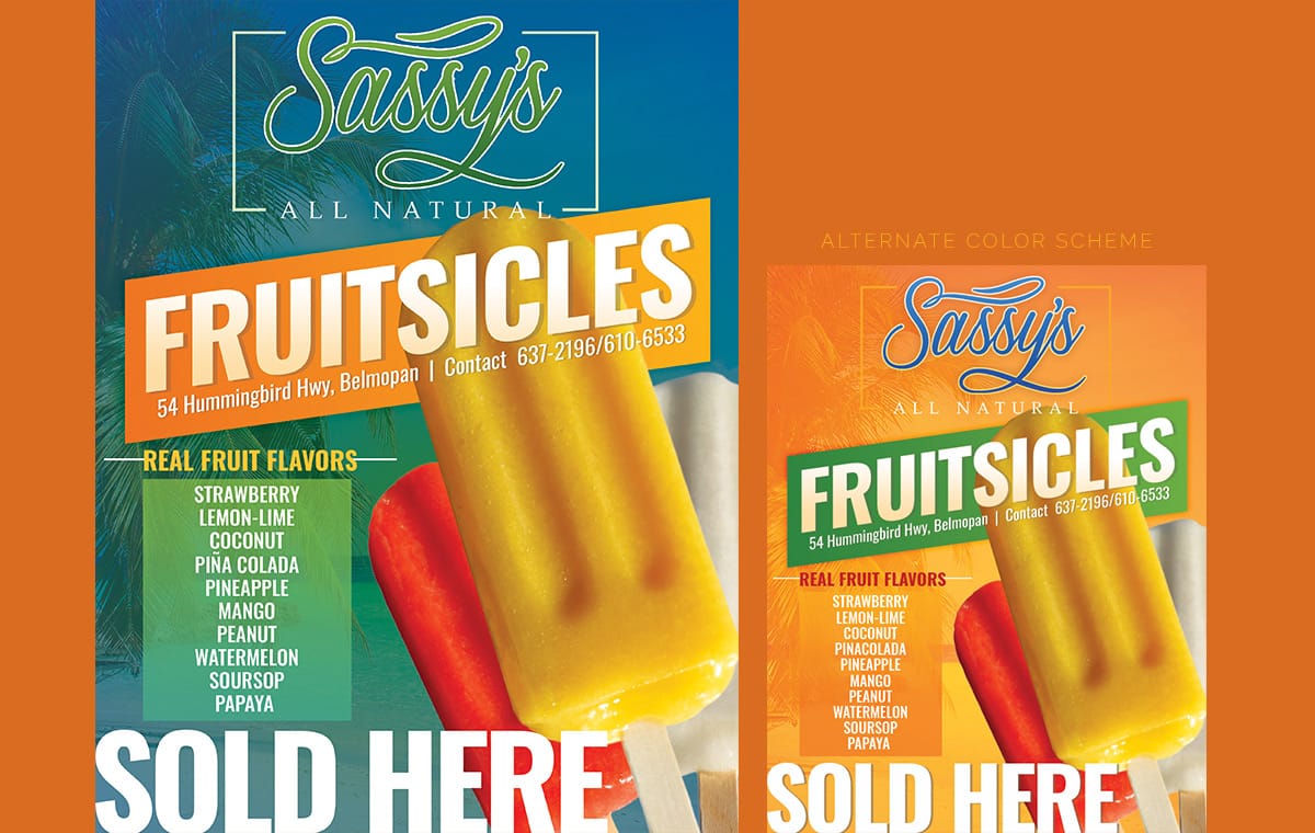 Fruitsicles product flyer design done for Sassy’s Dessert Factory.