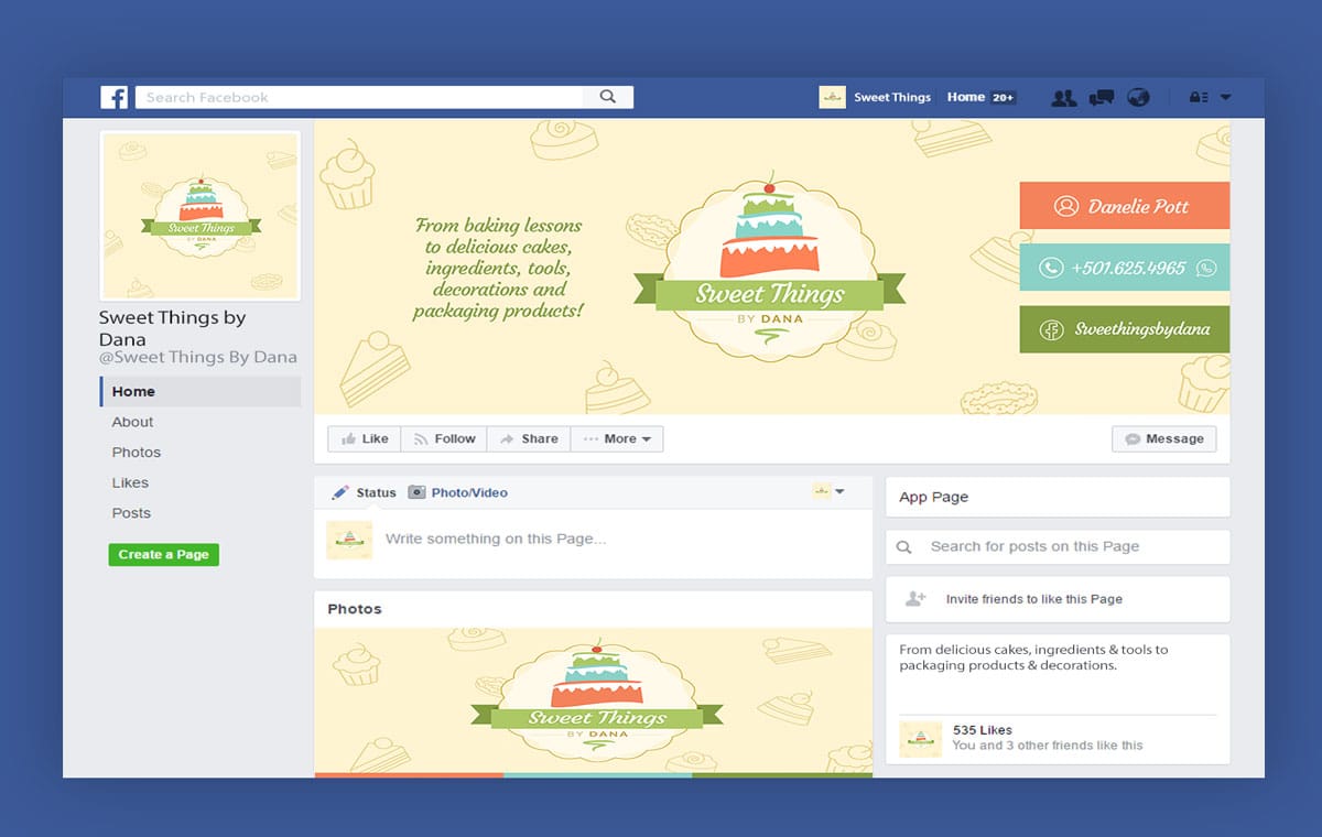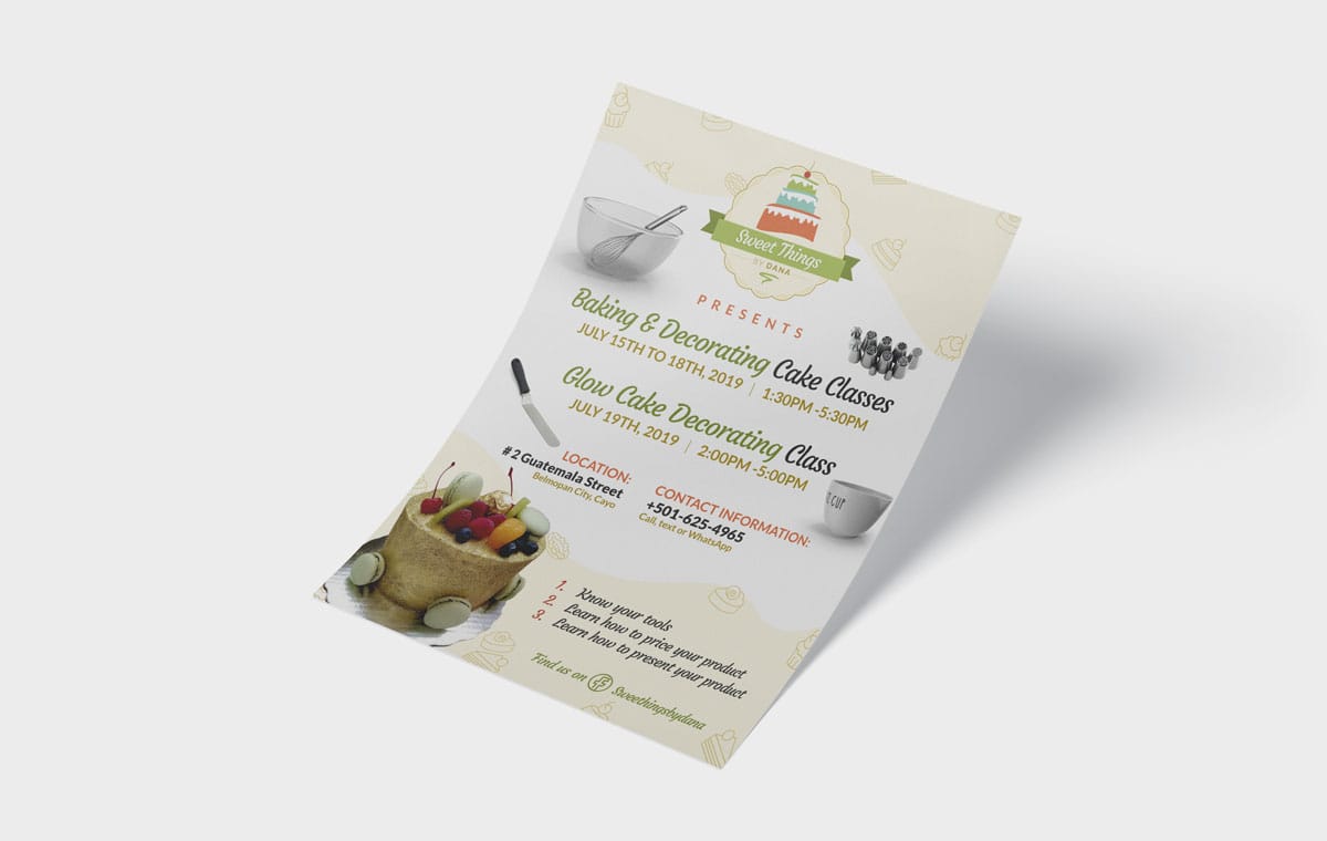 Logo design and branding created for Sweet Things By Dana. Includes logo design, business card, flyer, and Facebook profile.